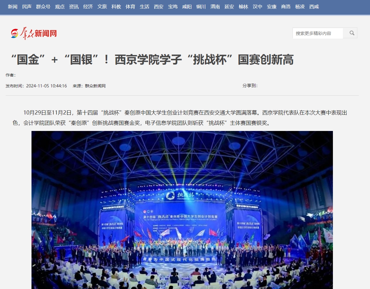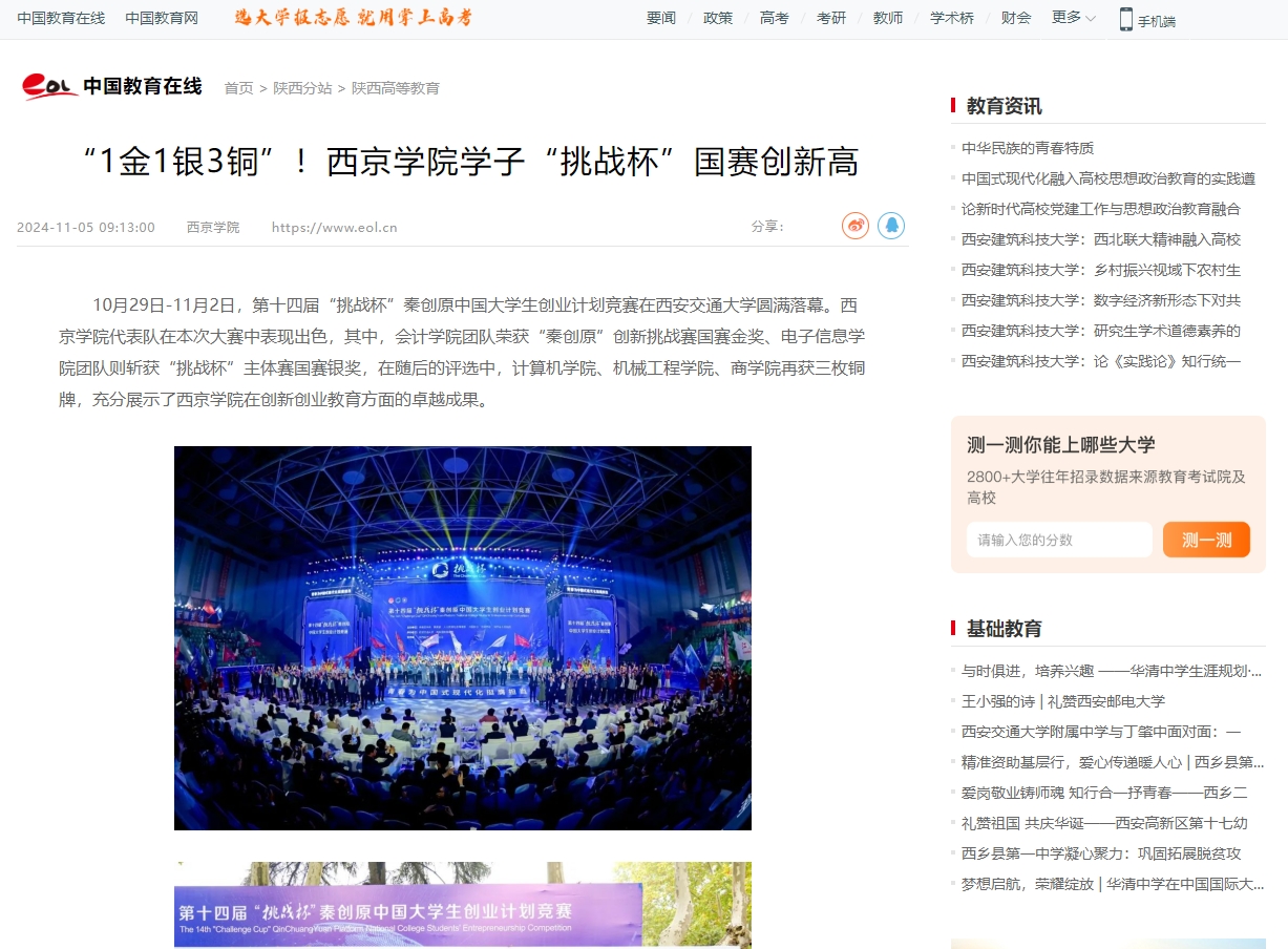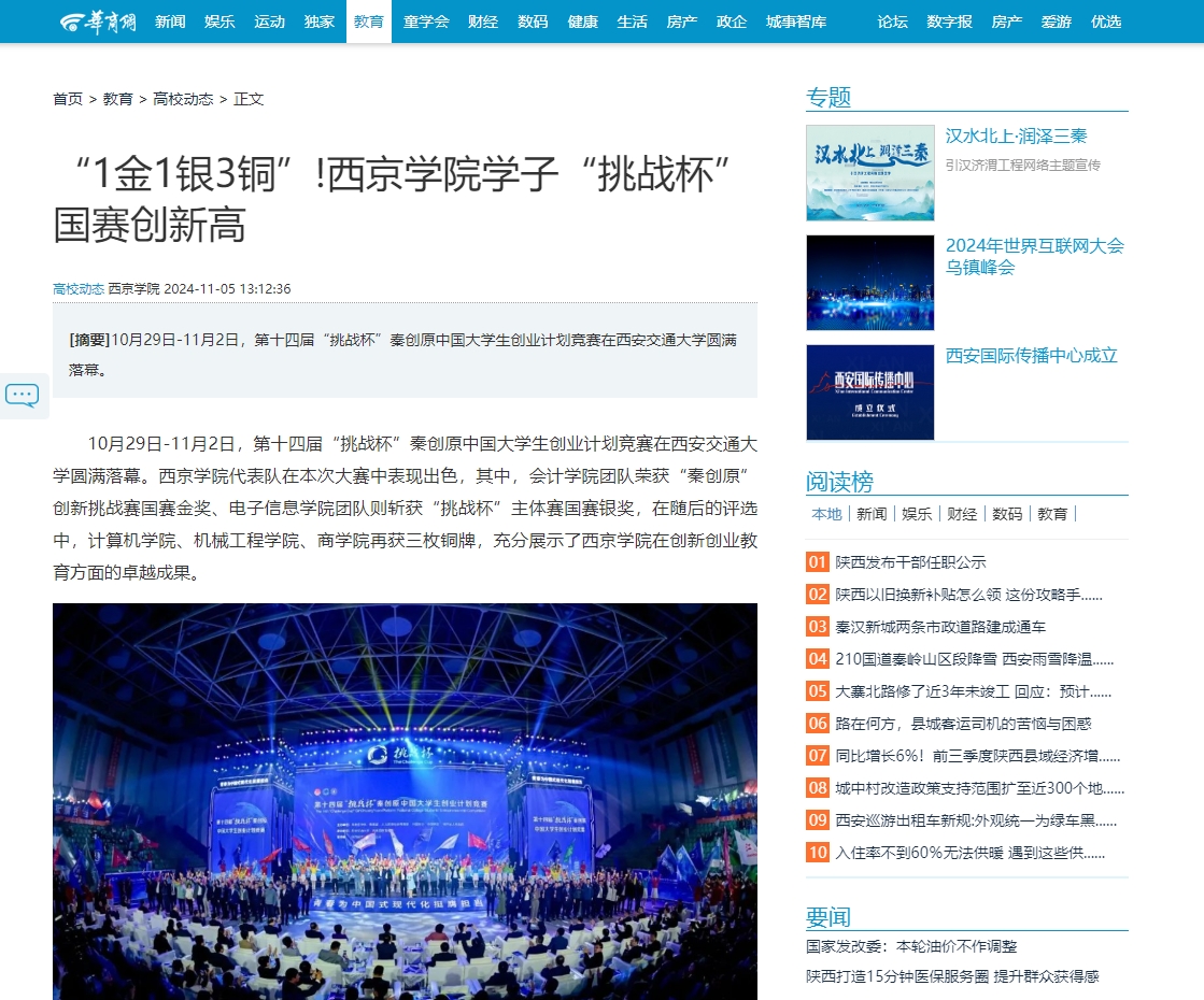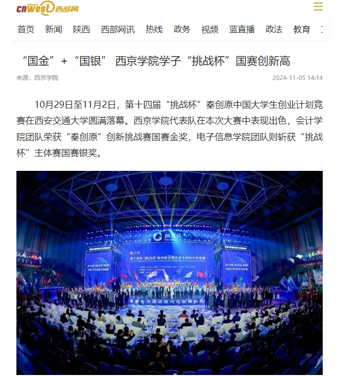 10月29日-11月2日,第十四届“挑战杯”秦创原中国大学生创业计划竞赛在西安交通大学圆满落幕。西京学院代表队在本次大赛中表现出色,其中,会计学院团队荣获“秦创原”创新挑战赛国赛金奖、电子信息学院团队则斩获“挑战杯”主体赛国赛银奖,在随后的评选中,计算机学院、机械工程学院、商学院再获三枚铜牌,充分展示了西京学院在创新创业教育方面的卓越成果。