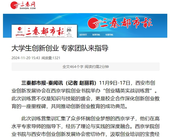 三秦都市报-秦闻讯(记者 赵丽莉)11月9日-17日,西安市创业创新发展协会在西京学院创业书院举办“创业精英实战训练营”。此次训练营不仅是知识与技能的盛会,更是校企合作深化创新创业教育的一座里程碑,共同推动创新创业教育的成功典范。此次训练营集训汇集了众多怀揣创业梦想的西京学子,他们在高水平专家导师的指导下,经历了理论与实践的深度融合。西京学院创业书院与西安市创业创新发展协会密切协作,汲取创业培训的宝贵....