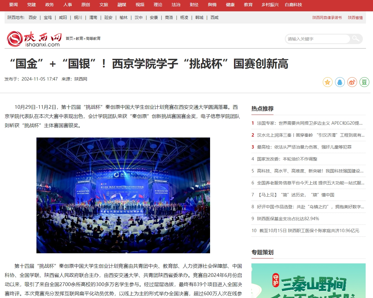 10月29日-11月2日,第十四届“挑战杯”秦创原中国大学生创业计划竞赛在西安交通大学圆满落幕。西京学院代表队在本次大赛中表现出色,其中,会计学院团队荣获“秦创原”创新挑战赛国赛金奖、电子信息学院团队则斩获“挑战杯”主体赛国赛银奖,在随后的评选中,计算机学院、机械工程学院、商学院再获三枚铜牌,充分展示了西京学院在创新创业教育方面的卓越成果。第十四届“挑战杯”秦创原中国大学生创业计划竞赛由共青团中央、教....